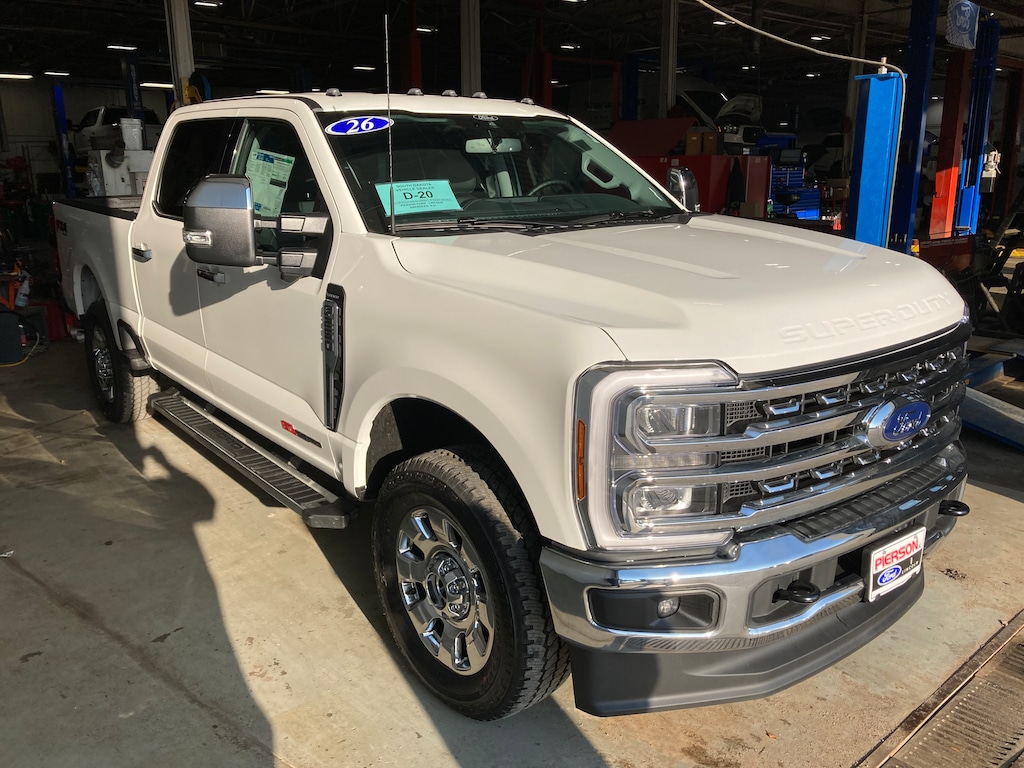 White 2026 Ford F-250SD Lariat 4WD 10-Speed Automatic 6.7L High Output Power Stroke V8 Diesel 4WD, ABS brakes, Alloy wheels, Compass, Electronic Stability Control, Front dual zone A/C, Heated door mirrors, Heated front seats, Heated rear seats, Illuminated entry, Low tire pressure warning, Remote keyless entry, Traction control.